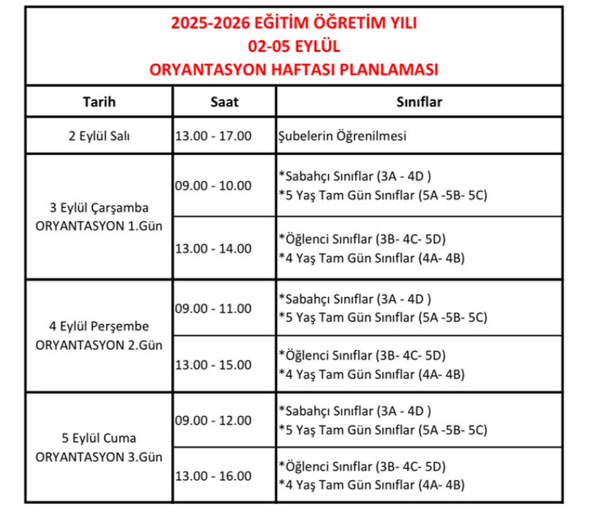Sevgili velilerimiz,Öğrencilerimizin okula uyum sürecini kolaylaştırmak amacıyla hazırlanan oryantasyon programımız görselde yer almaktadır.Katılım, çocuklarımızın yeni döneme daha hızlı ve mutlu adapte olabilmeleri için önemlidir.