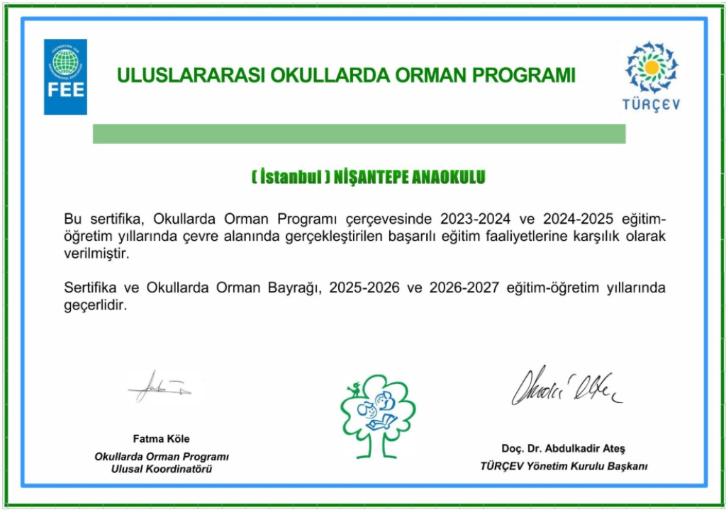 Okulumuzda 2023-2024 ve 2024-2025 Eğitim Öğretim yılında uygulamış olduğumuz Okullarda Orman Projesini başarıyla tamamlamış olup bayrak sertifikasını okulumuza kazandırdık. Proje boyunca destek veren başta öğretmenlerimiz olmak üzere öğrencilerimize ve velilerimize teşekkür ederiz.